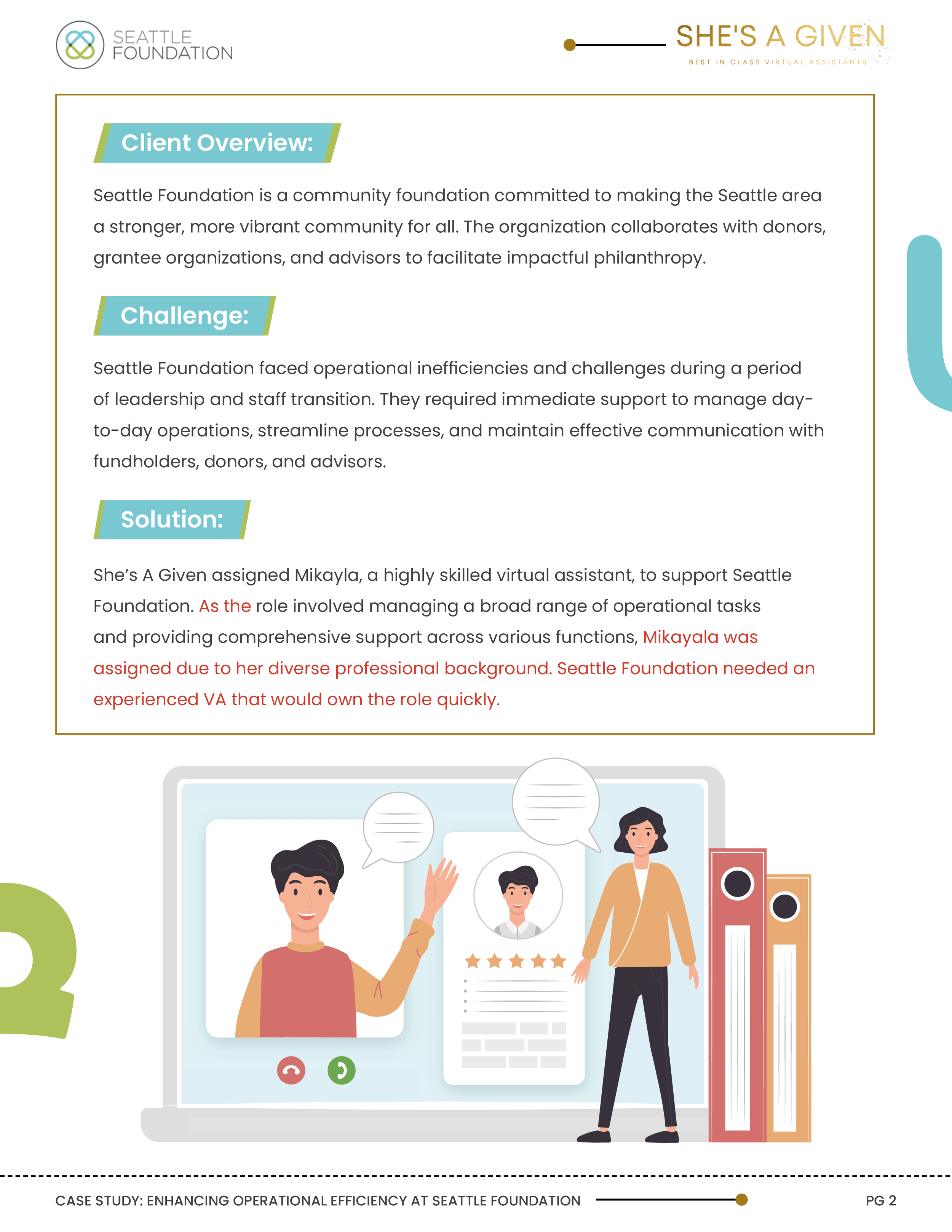 She's A Given assigned Mikayla, a highly skilled virtual assistant, to support Seattle Foundation. As the role involved managing a broad range of operational tasks and providing comprehensive support across various functions, Mikayala was assigned due to her diverse professional background. Seattle Foundation needed an experienced VA that would own the role quickly.